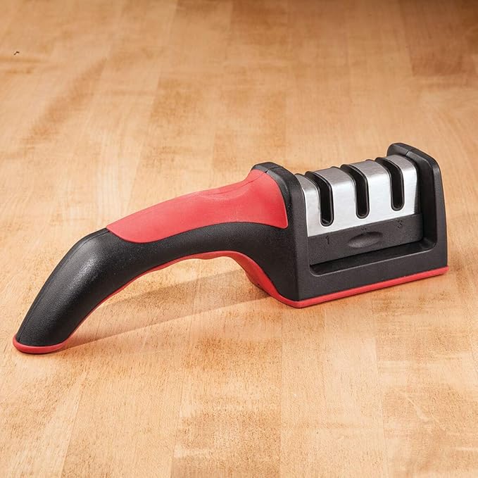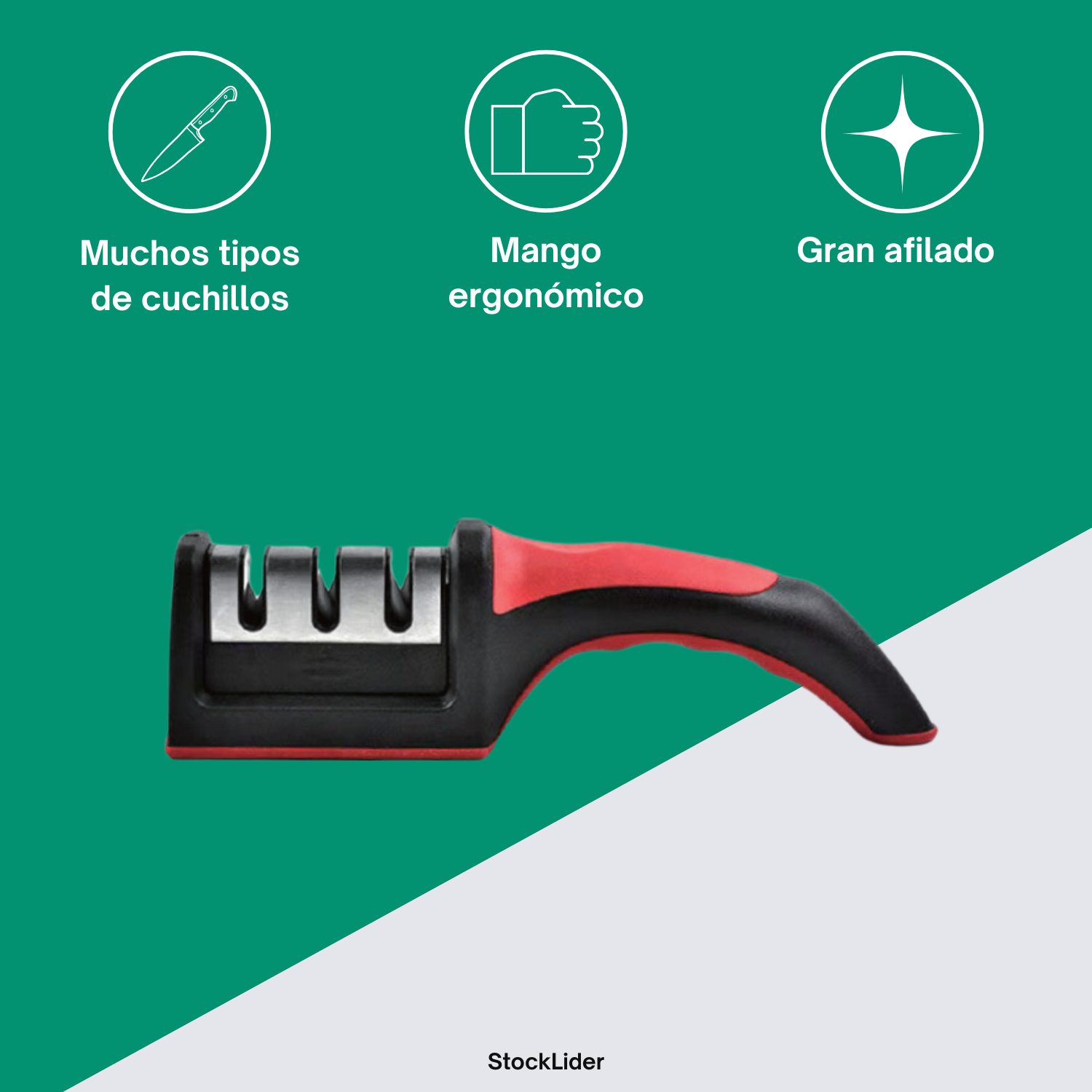 Diseñado para un fácil uso zurdo o diestro, el mango es ergonómico, y la base antideslizante mantiene este pequeño afilador de cuchillos en su lugar mientras está en uso.
