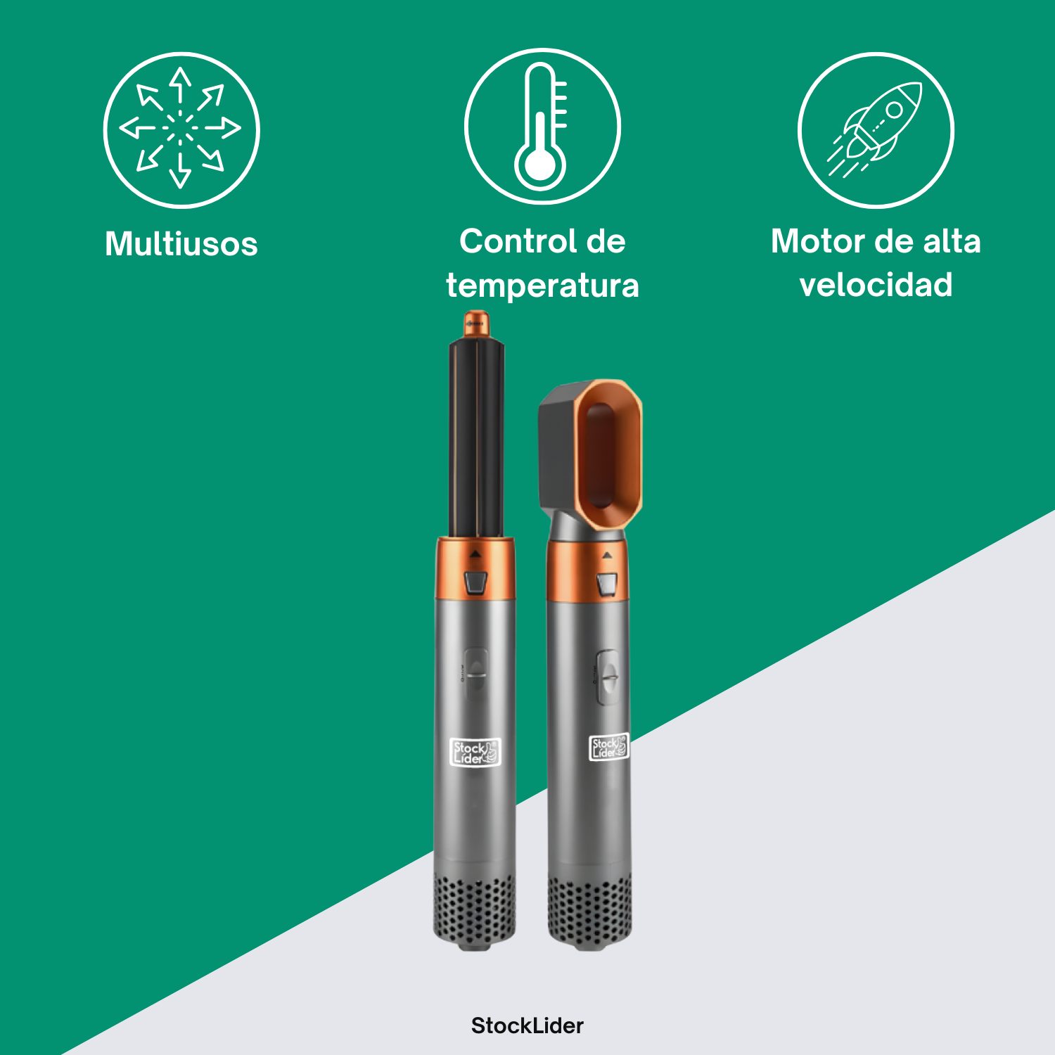 El dispositivo cuenta con bloqueo/desbloqueo de accesorios para un cambio rápido y seguro, sistema anti-escaldadura para evitar quemaduras y un interruptor de temperatura ajustable con tres niveles: baja para cabellos finos, media para cabello normal, y alta para cabellos gruesos.