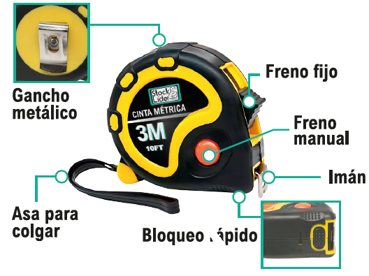 La Cinta Métrica StockLíder de 3 metros es la herramienta ideal para quienes buscan precisión, durabilidad y comodidad en cada medición. Su cinta metálica reforzada con sistema de rebobinado automático permite trabajar de manera ágil y eficiente, ahorrando tiempo y esfuerzo en cualquier tarea.