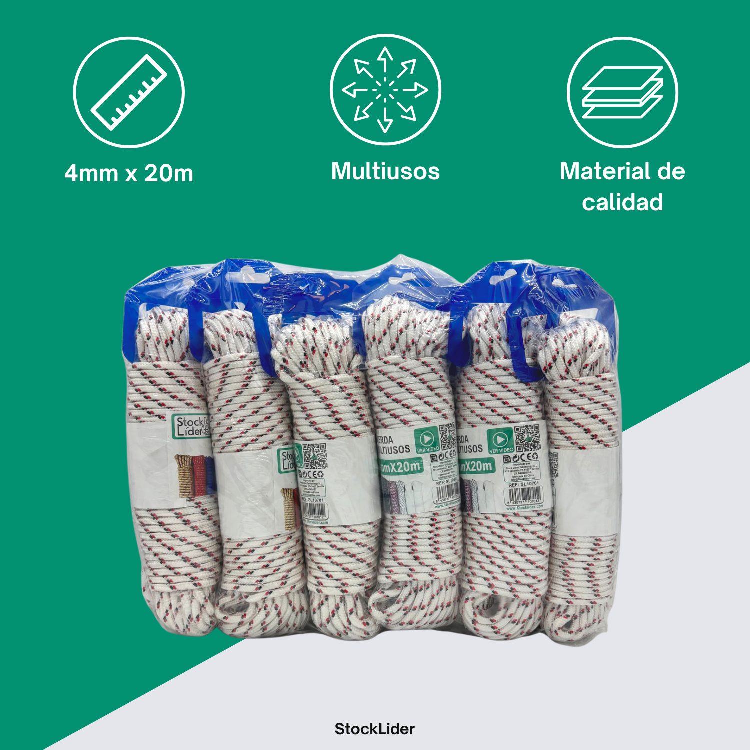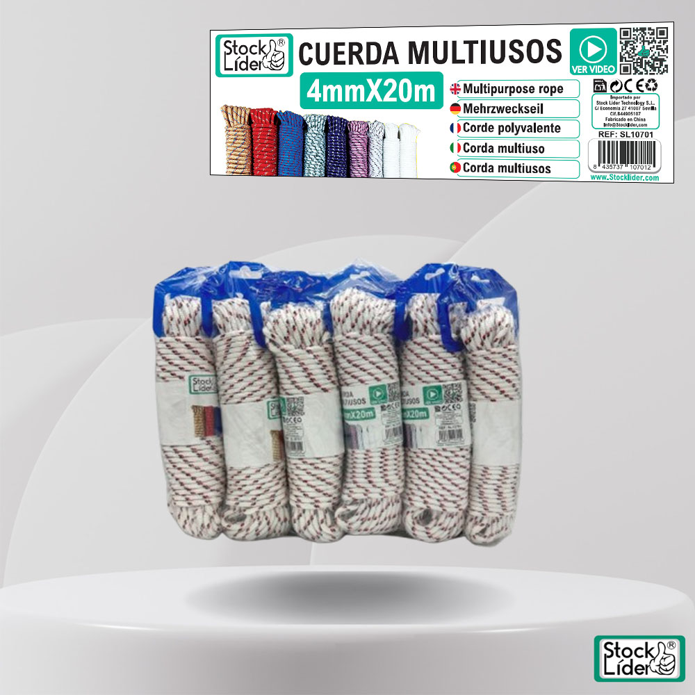 La Cuerda Multiusos es la solución práctica y resistente para todo tipo de tareas en casa, jardín, bricolaje o actividades al aire libre. Disponible en diferentes grosores y longitudes, se adapta a tus necesidades con total versatilidad: 4mm x 20m, 6mm x 10m, 8mm x 10m y 5.5mm x 10m.