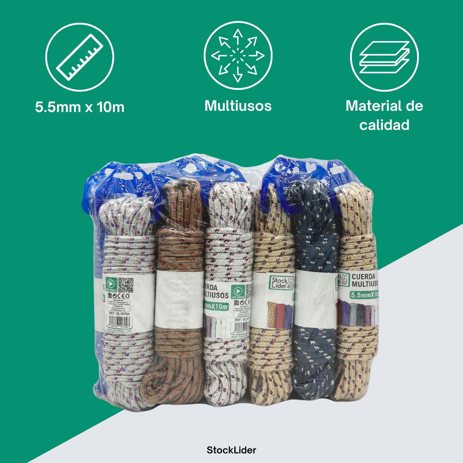 La Cuerda Multiusos StockLíder es la solución práctica y resistente para todo tipo de tareas en casa, jardín, bricolaje o actividades al aire libre. Disponible en diferentes grosores y longitudes, se adapta a tus necesidades con total versatilidad: 4mm x 20m, 6mm x 10m, 8mm x 10m y 5.5mm x 10m.