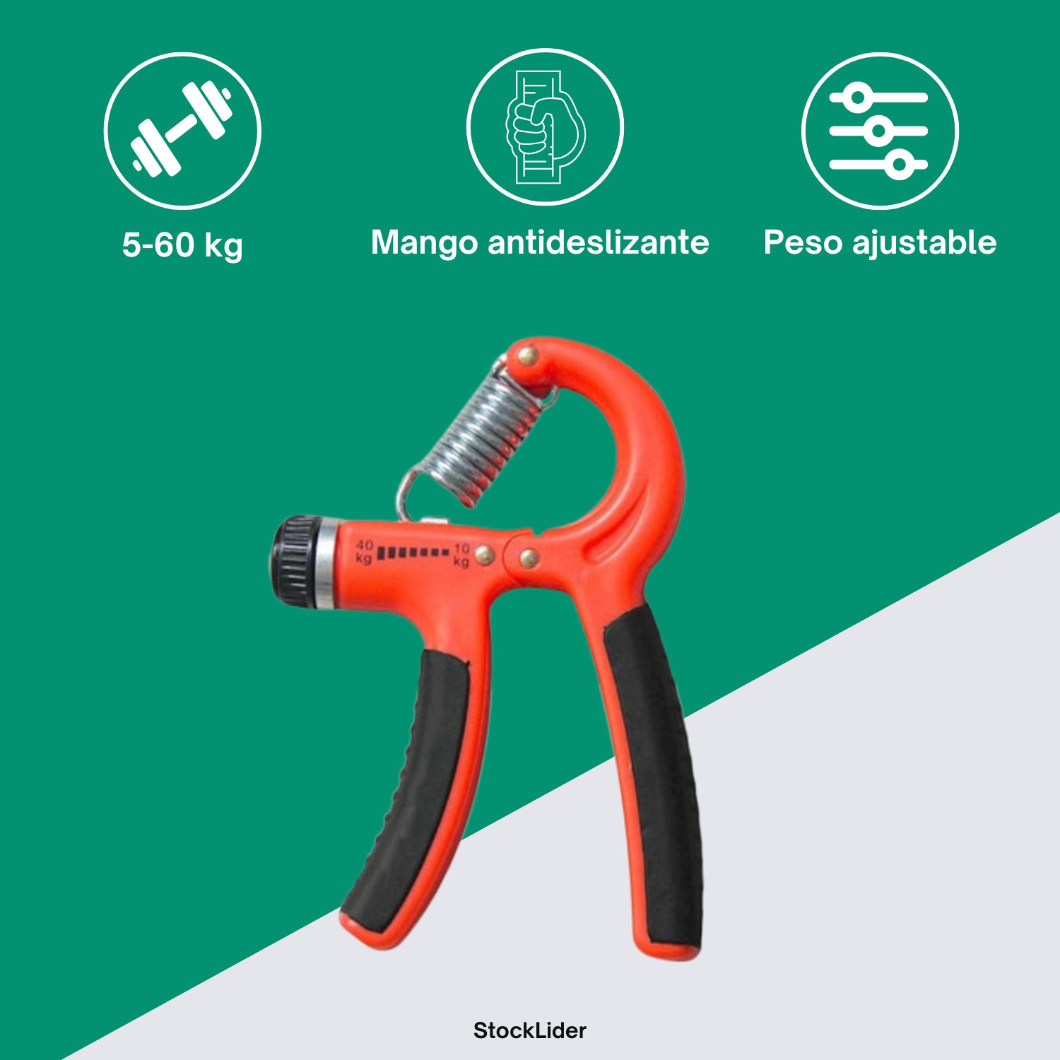 Su diseño ergonómico con mango antideslizante garantiza comodidad y seguridad durante cada uso, adaptándose perfectamente a la forma de la mano. Gracias a su rueda de ajuste de resistencia, puedes regular la presión entre 5 y 60 kg, permitiéndote avanzar a tu propio ritmo y nivel de fuerza.