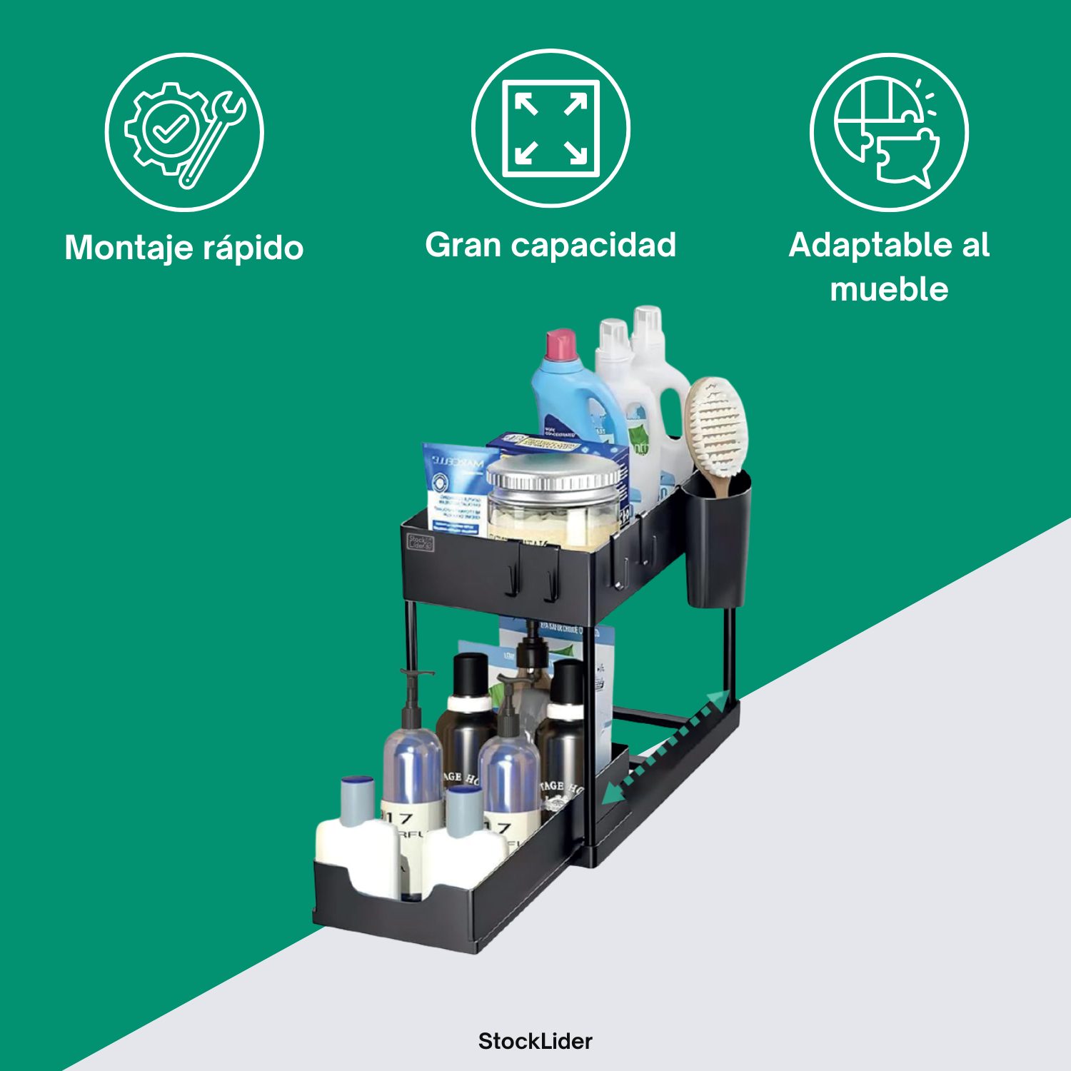 El Organizador Bajo Mueble Stock Líder es la solución ideal para maximizar el espacio en tu cocina, baño, lavadero o escritorio. Gracias a su diseño compacto y funcional, te permite mantener todo en orden y al alcance de la mano, incluso en los rincones más difíciles de aprovechar.