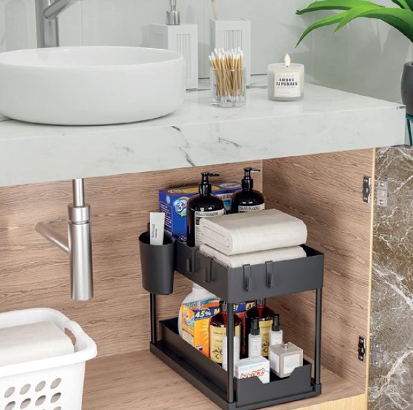 El organizador cuenta con una cesta inferior deslizante para un acceso cómodo, múltiples compartimentos para separar productos, y un diseño moderno en color negro que se adapta a cualquier estilo de decoración. También incluye un recipiente colgante lateral ideal para cepillos, peines o accesorios.