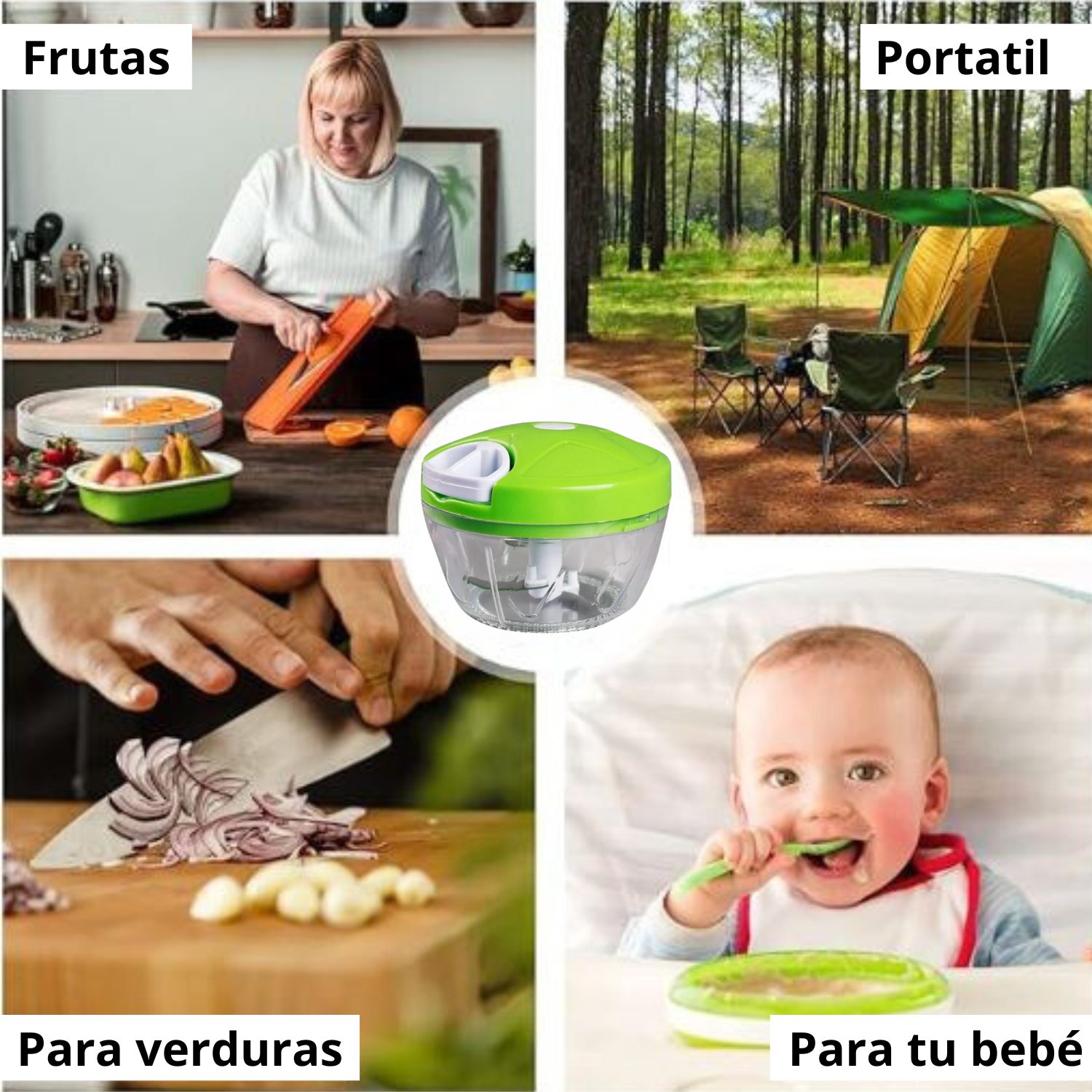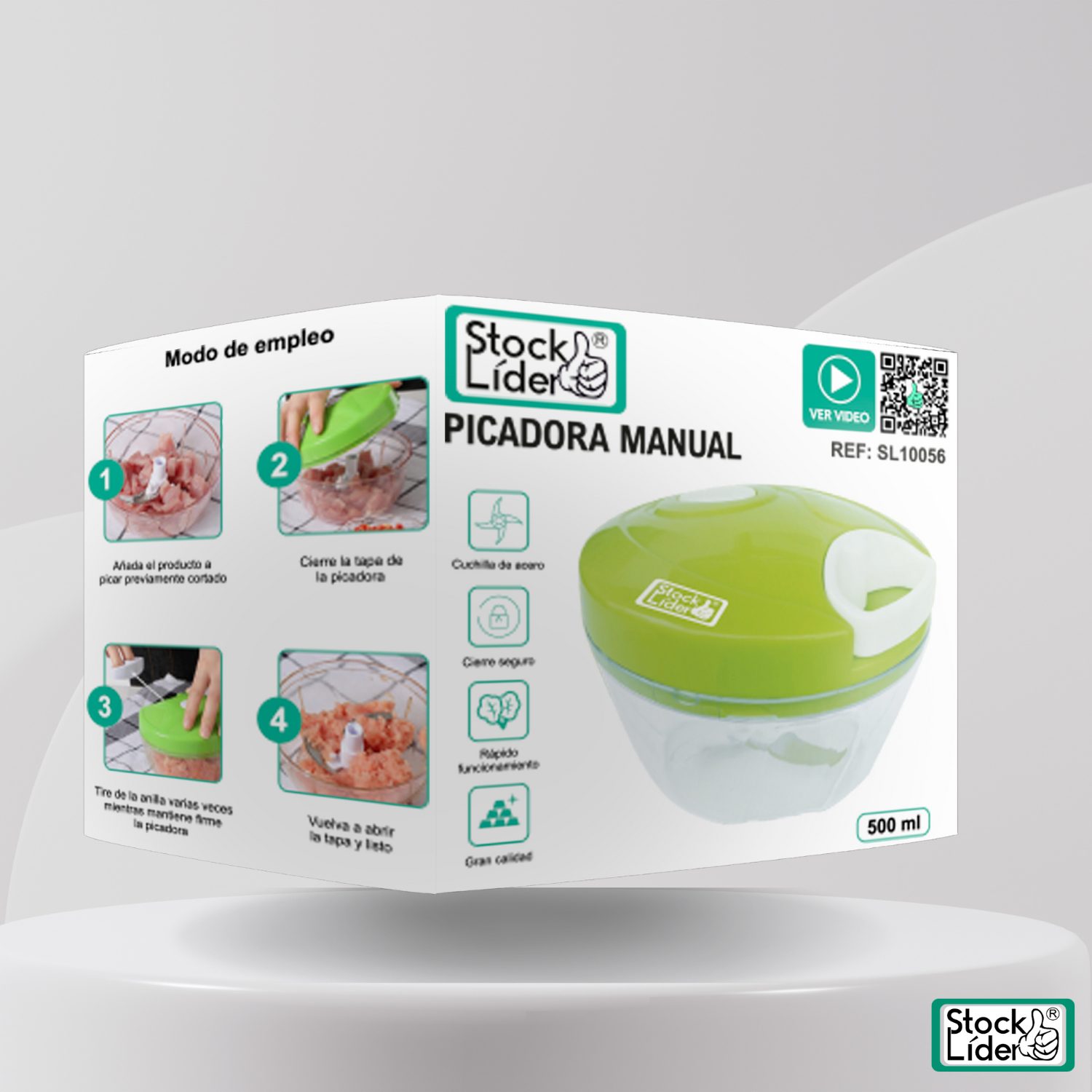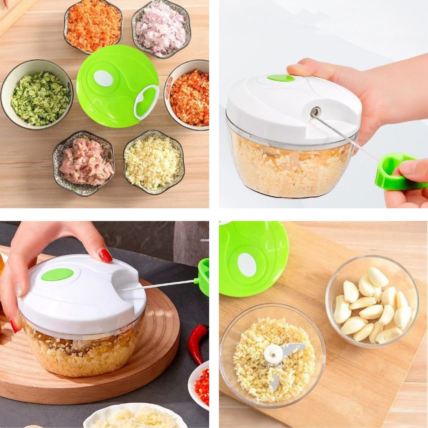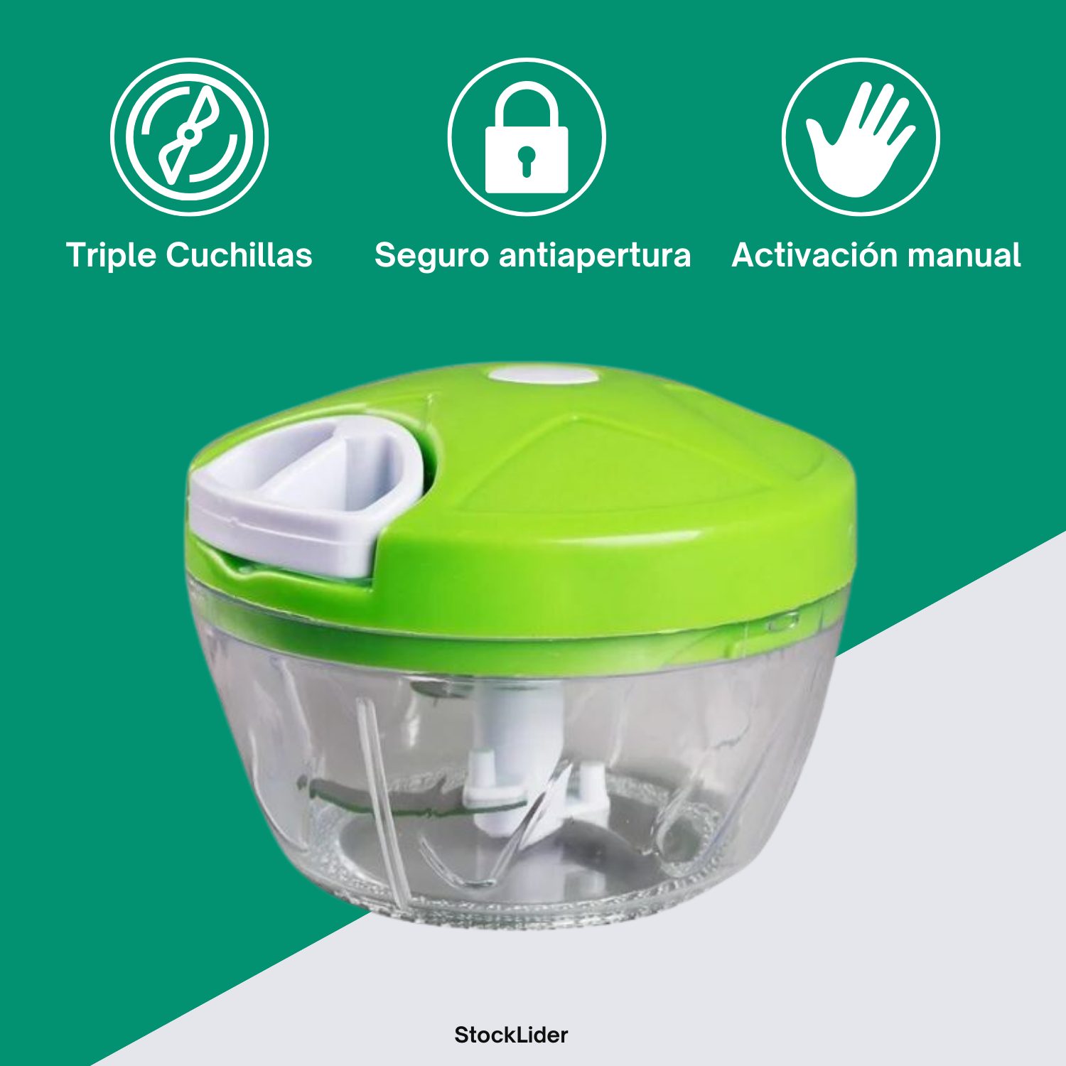 El picador de alimentos está fabricado con materiales aptos para uso alimentario de alta calidad y sin plástico. Ningún daño a su salud. Cuando se tira del anillo, la cubierta se bloqueará de forma segura en el arco.