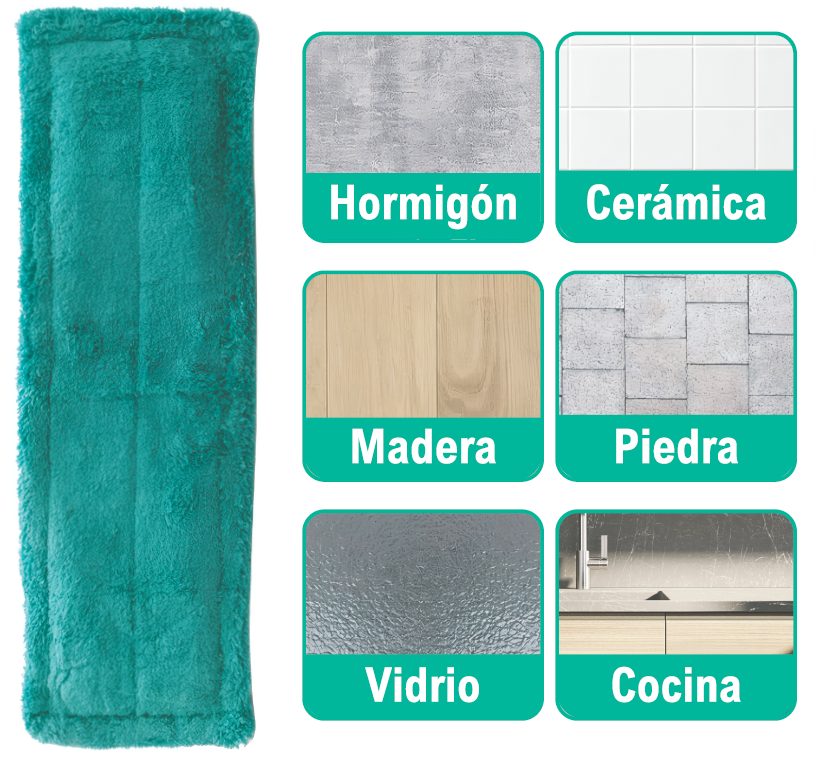 Fabricado en microfibra 100% poliéster, ofrece una alta capacidad de absorción que atrapa polvo, suciedad y humedad de forma rápida y eficaz, dejando cada espacio limpio y brillante tras cada pasada.