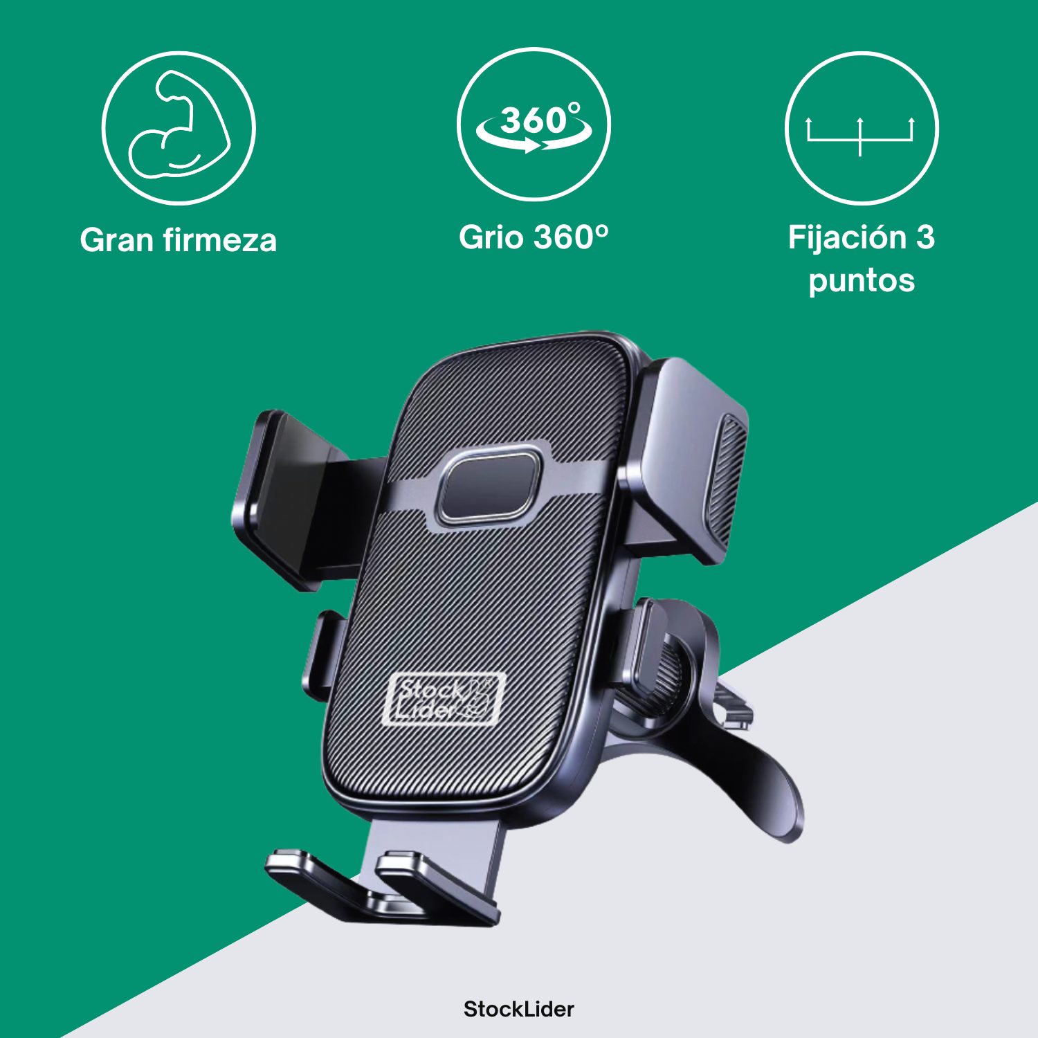 Este soporte es compatible con todo tipo de rejillas del vehículo gracias a su pinza ajustable y su diseño universal. Además, incorpora un mecanismo giratorio 360°, permitiendo colocar el móvil tanto en posición vertical como horizontal de forma rápida y segura. Ideal para usar GPS, llamadas manos libres o para acceder a tus apps favoritas sin distracciones.