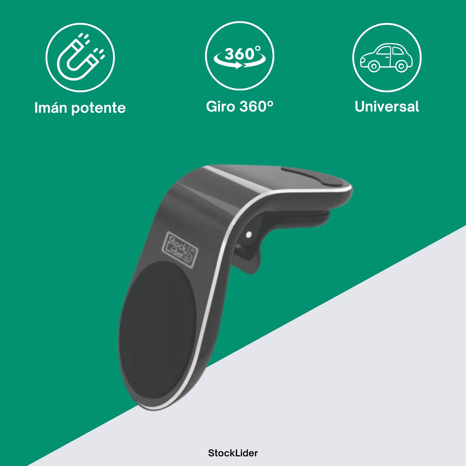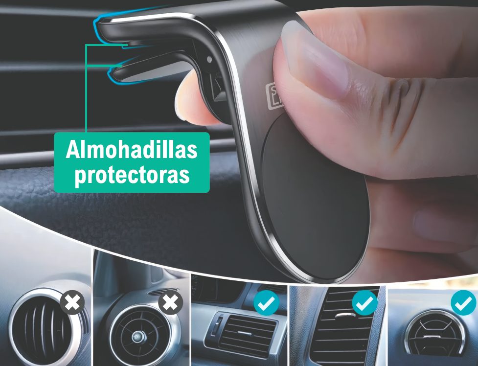 El soporte cuenta con rotación de 360°, para ajustar el ángulo perfecto de visión, ya sea para usar el GPS, contestar llamadas con manos libres o reproducir música durante tus viajes. Además, incorpora almohadillas protectoras que evitan rayaduras en las rejillas de ventilación, cuidando el interior de tu vehículo.